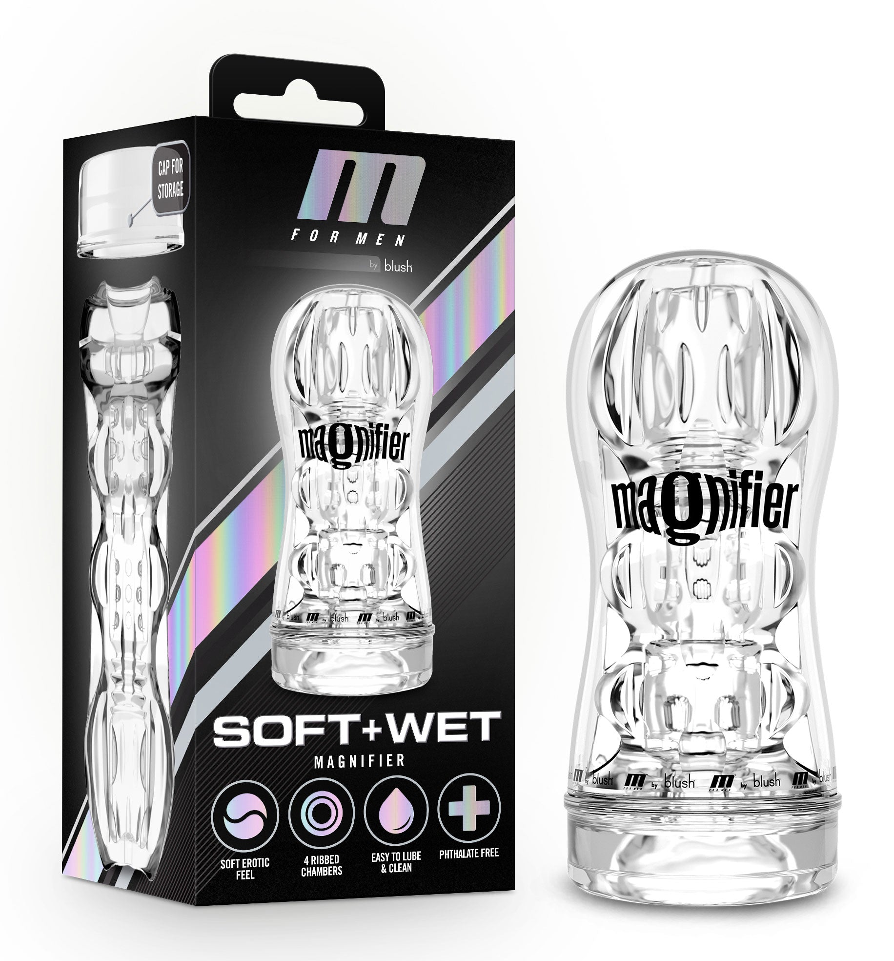 The M for Men Magnifier is loaded with fun! This pocket stroker is clear, allowing you to watch as you use! Magnifier is also Self-Lubricating. Add a little water or saliva and everything gets slippery, just like the real thing! There are multiple chambers and unique textures inside that assist with a powerful suction feel. These multiple chambers create an unparalleled feeling and enhanced pleasure no matter where you decide to play. M for Men masturbators are soft, flexible, and filled with sensational textures. Made of premium TPE, Magnifier is fragrance free, and phthalate free and is squeezable. As with all products and/or materials at Blush it has been 3rd party lab tested to meet or exceed REACH and Prop65 safety compliance directives. It's your body. Be mindful of what you put in it.